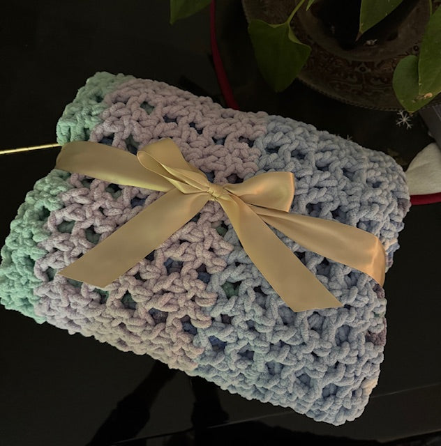 Large 46" X 60" handmade afghan color blocked with soft pastel lavender, green, blue, and matching camo style multi-color chenille yarn.
